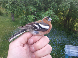 Dagens lediga tid ägnades uteslutande åt ringmärkning. Omedelbart efter jobbet åkte jag till vår kolonistuga och ringmärkte under 6 timmar. Det blev inte så många fåglar i näten, men jag fick en koltrast som jag märkt 2009 i samma område samt lite annat. Tack vare fågelbristen så blev fönstrena kittade och nästa gång ska de målas.